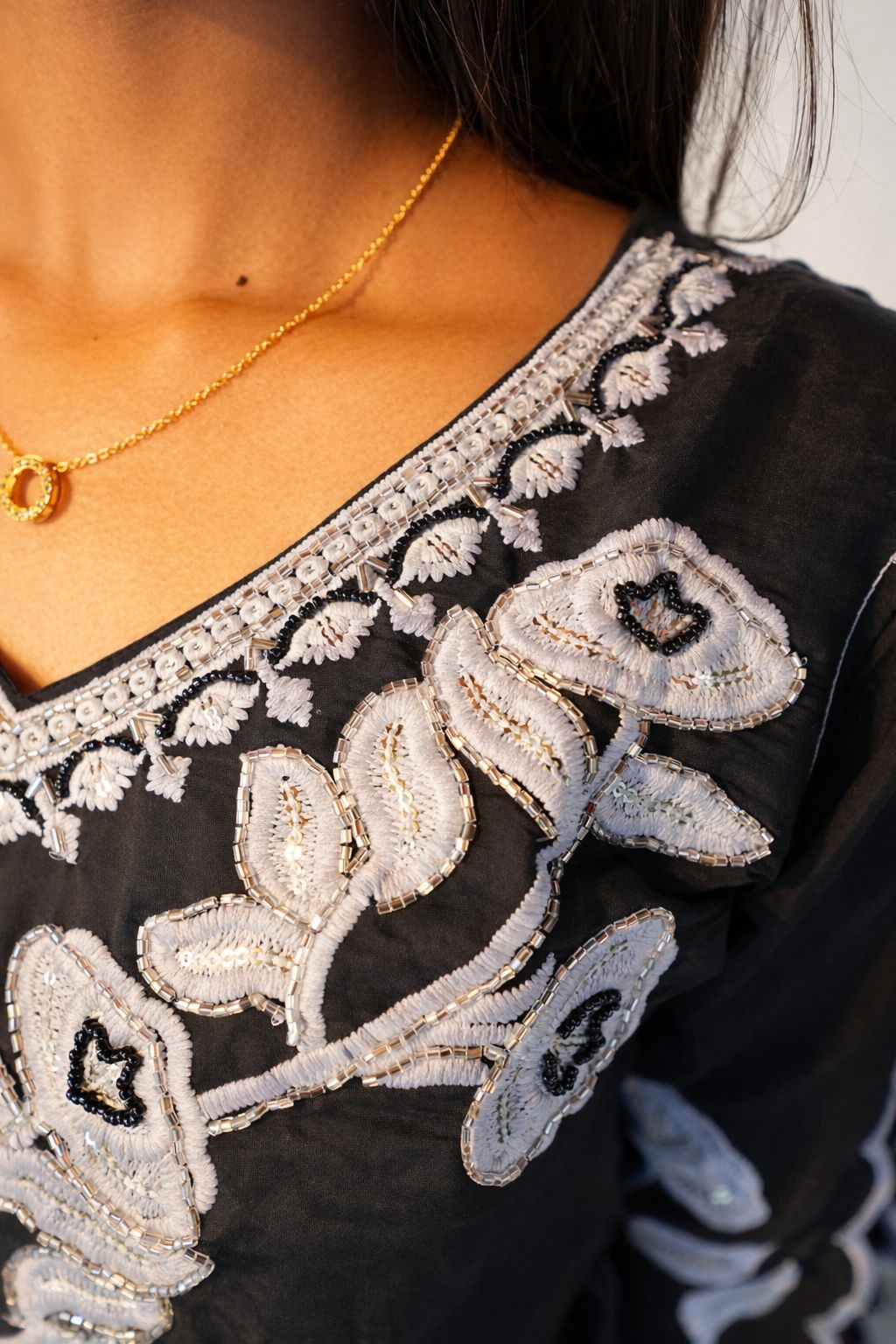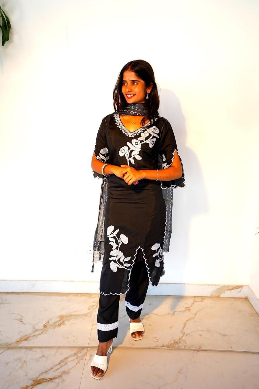 Elegant black Pakistani suit featuring intricate white floral embroidery on the neckline and sleeves, paired with a sheer embroidered dupatta. A timeless statement for festive and evening wear.