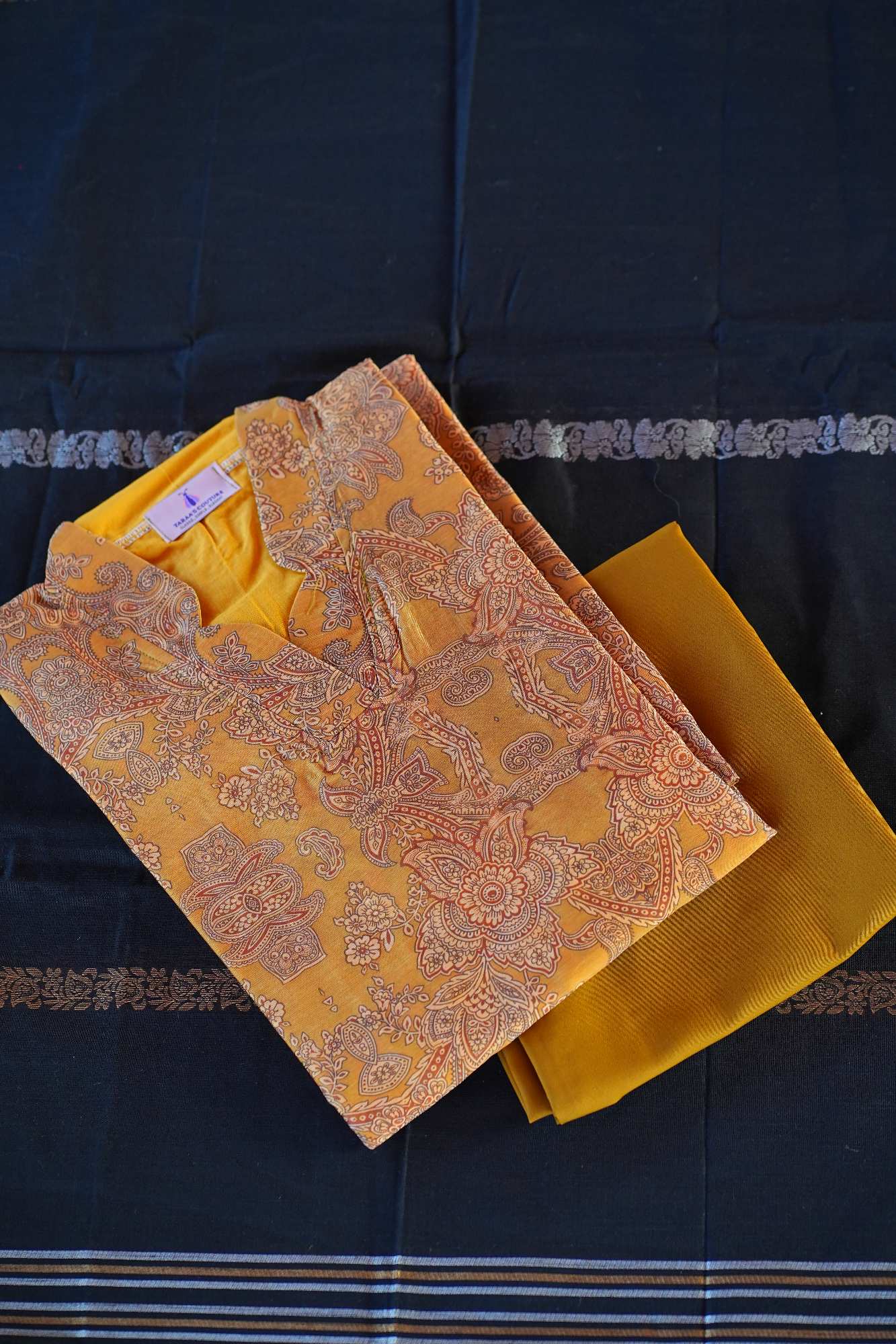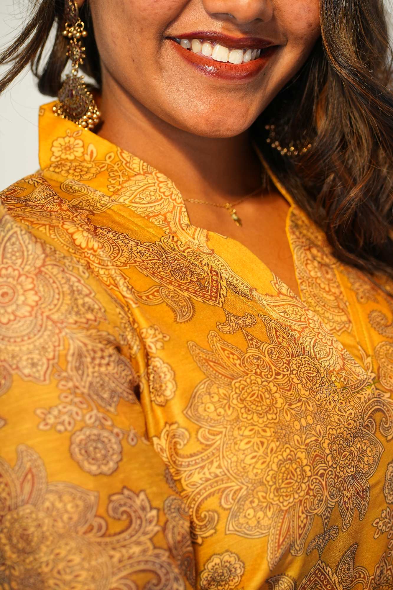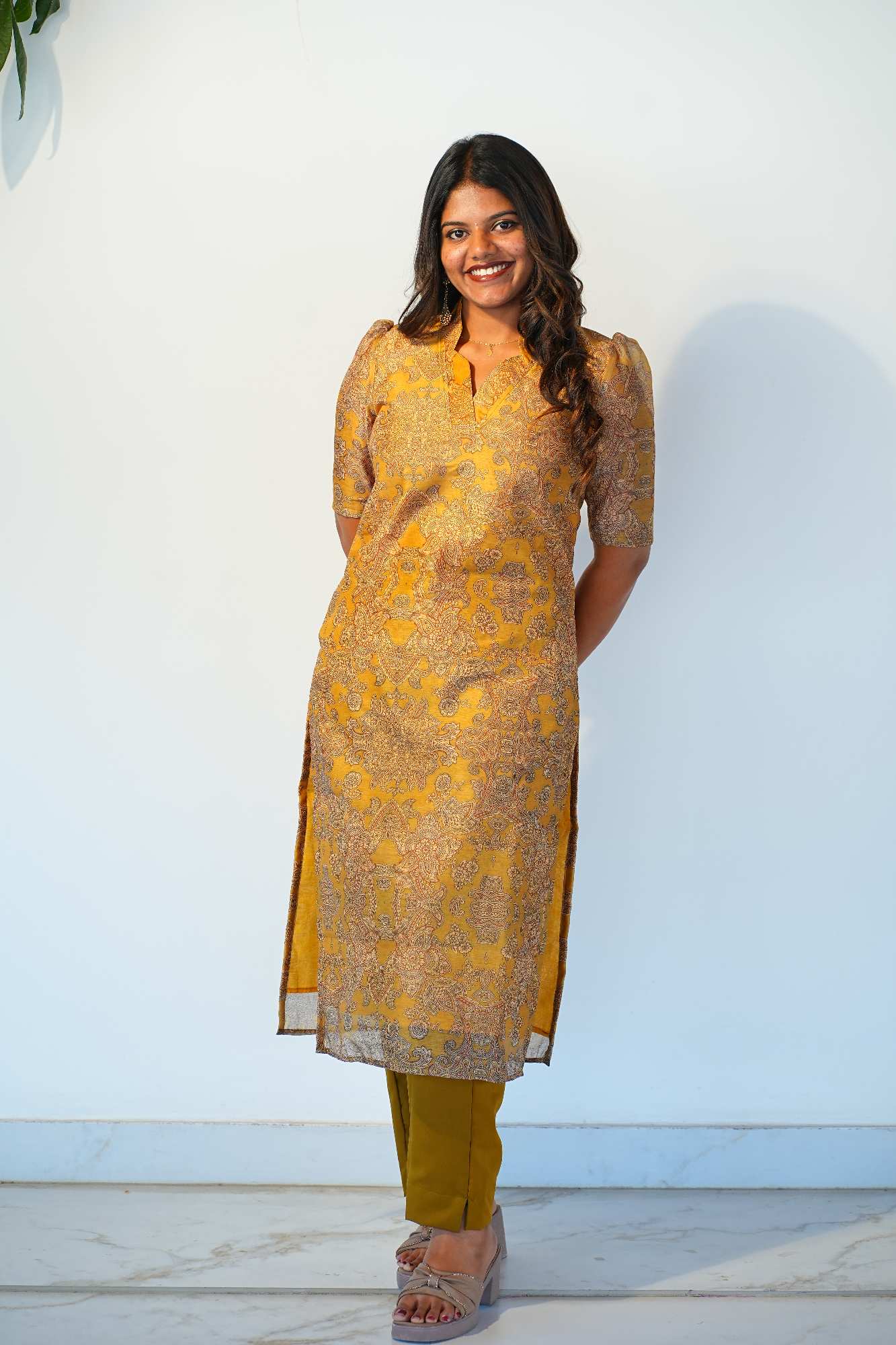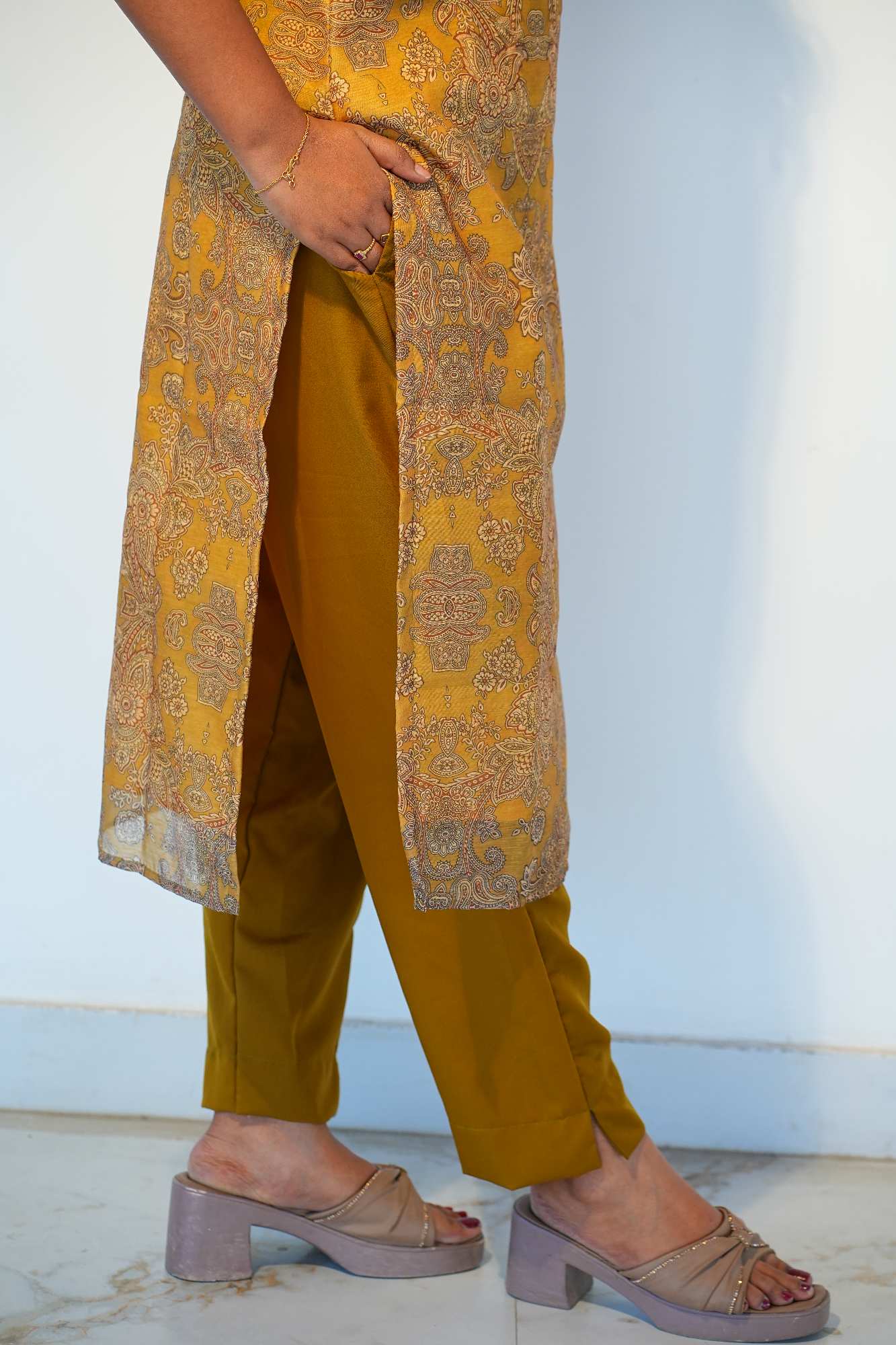 An elegant mustard-colored Chanderi set featuring beautiful digital prints, paired with a comfortable crepe pant. Light, graceful, and perfect for festive and everyday ethnic wear.