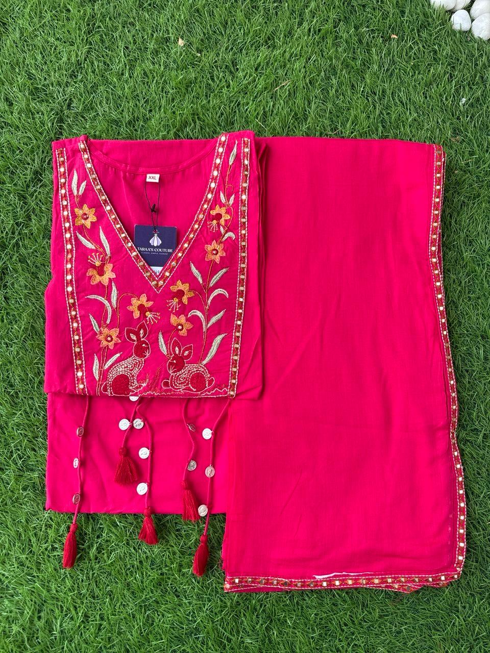 Elegant Ruby Pink 60-60 cotton suit set featuring beautiful floral embroidery with delicate threadwork and unique deer motifs on the neckline. The V-neck design with contrast detailing adds a rich, classy touch.Paired with a matching bottom and dupatta finished with subtle border detailing for a complete coordinated look.