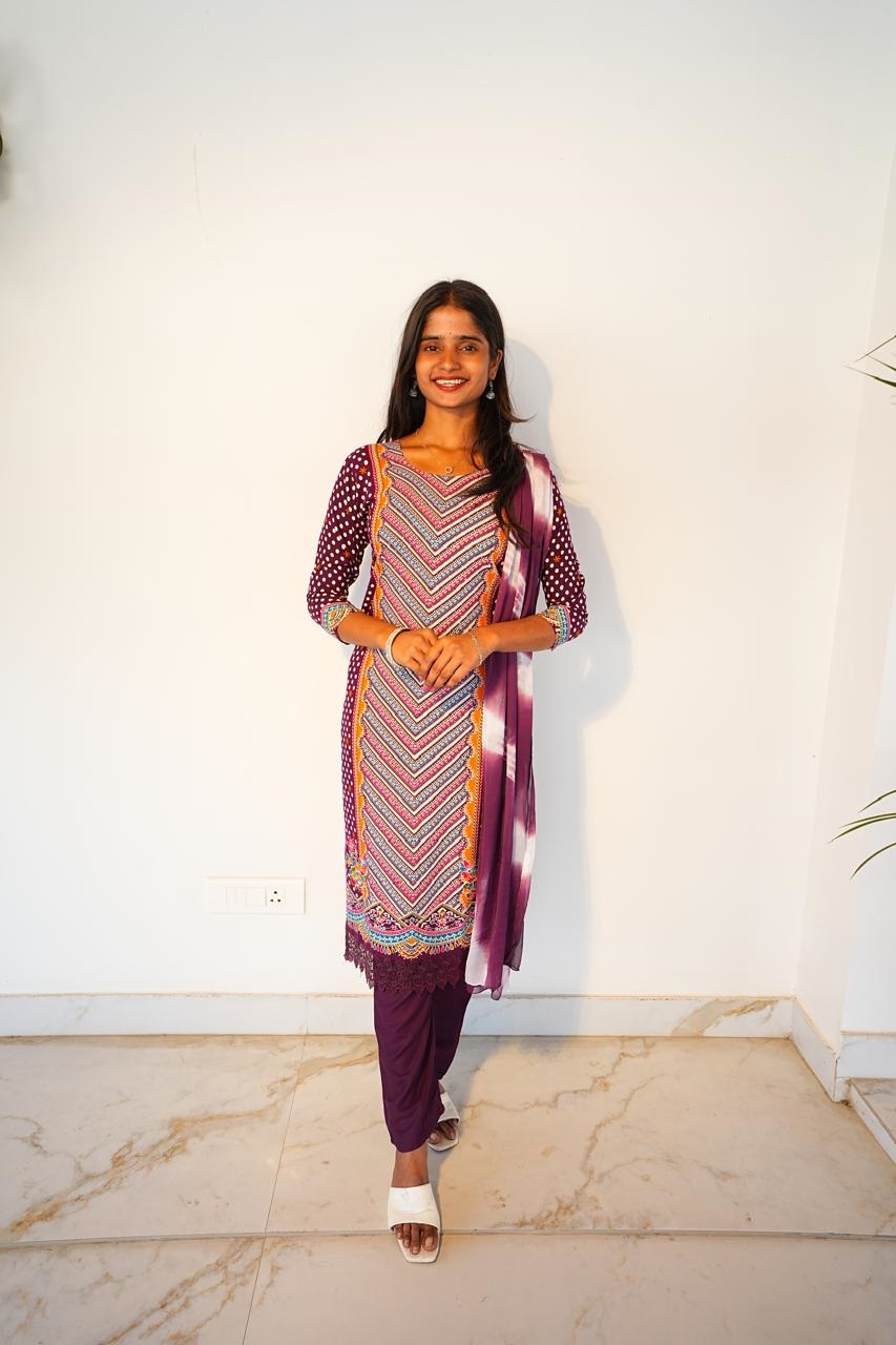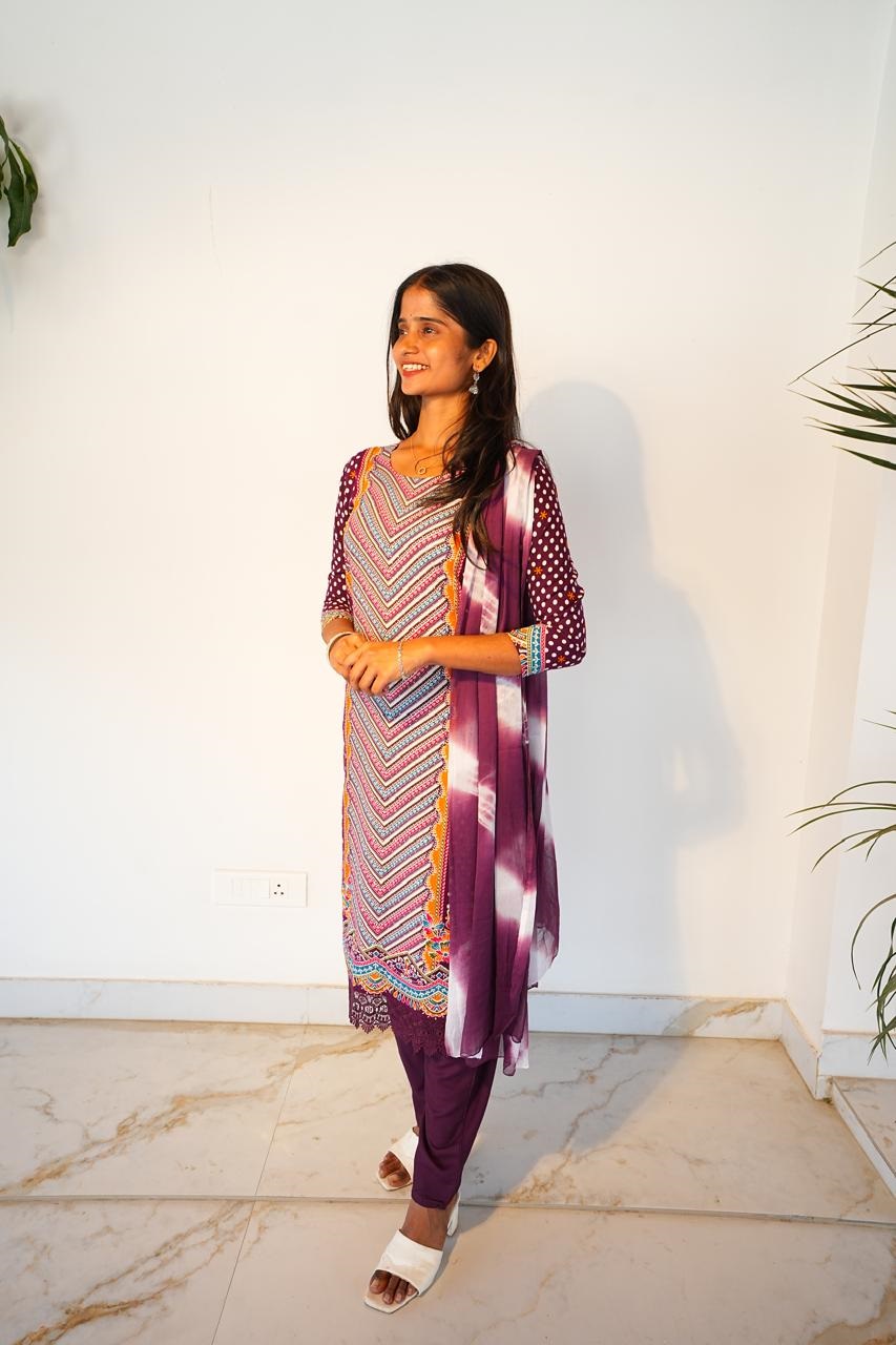 Stylish printed kurta set with matching pants and a shaded dupatta.